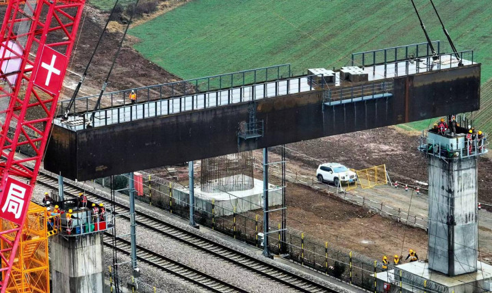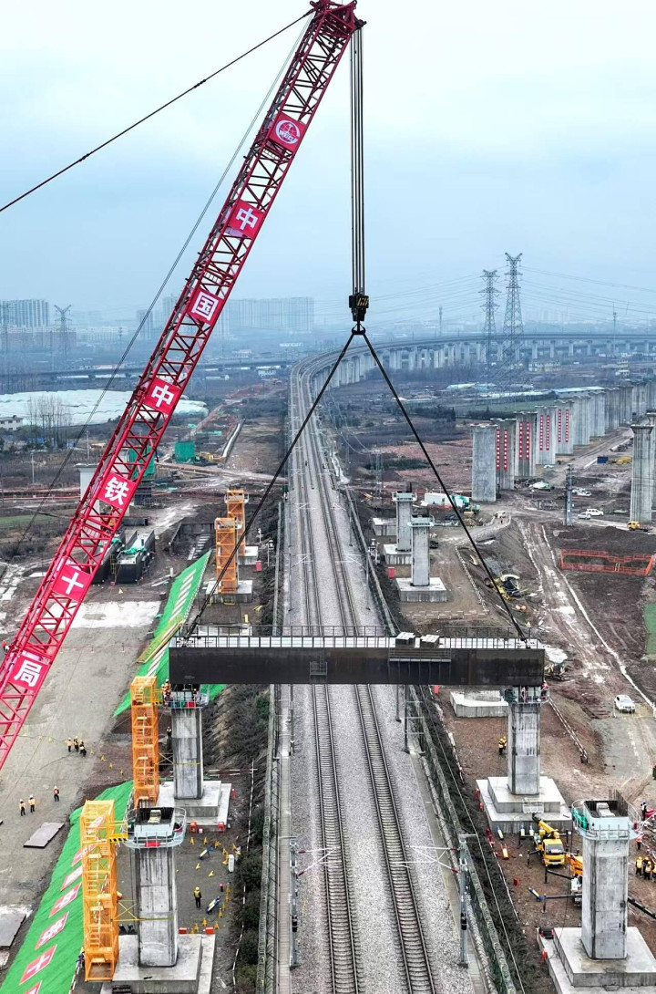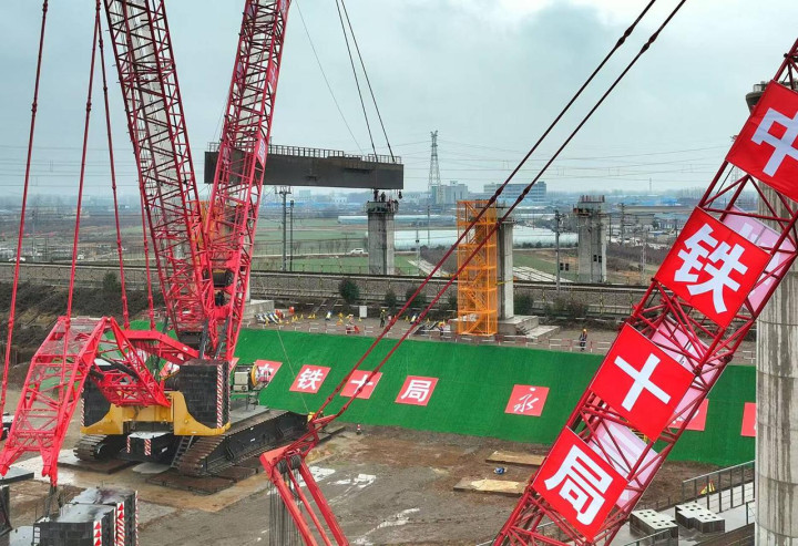 此次作业高效完成2榀最大起吊重量达254.08吨的钢横梁吊装,实现钢横梁与预埋件精准对接,不仅攻克了跨运营高铁施工的关键难点,更为全线推进奠定坚实基础。
